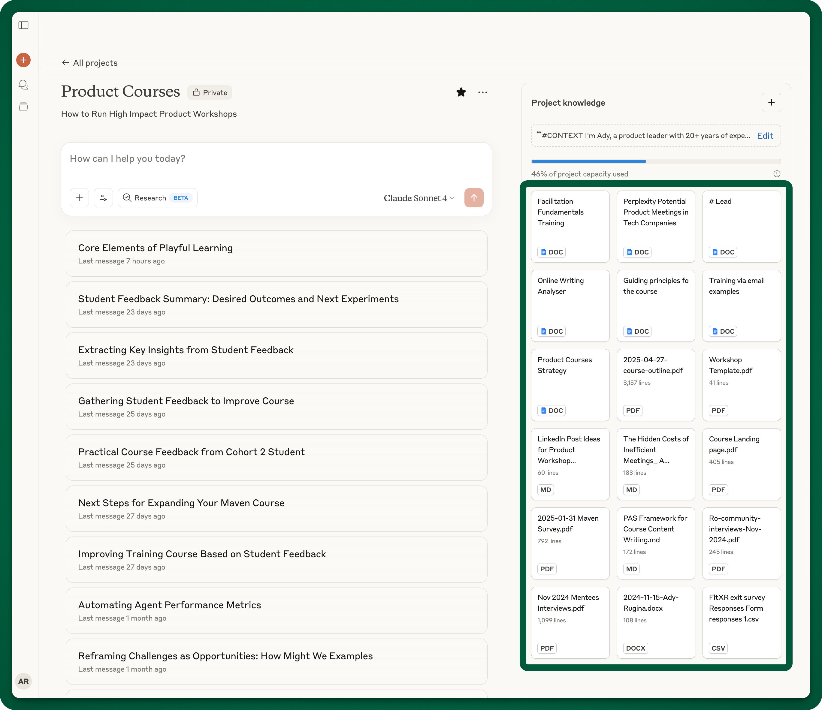 When I start a new project, I imagine I have a new teammate who needs to understand what I’m working on. As I would with a person, I invest time upfront in providing context. Loads of context: why this is important, information about myself, what my expectations are, strategy documents, meeting notes, org charts, customer research, examples of what good looks like… Anything I'd find relevant if I were new to this piece of work.